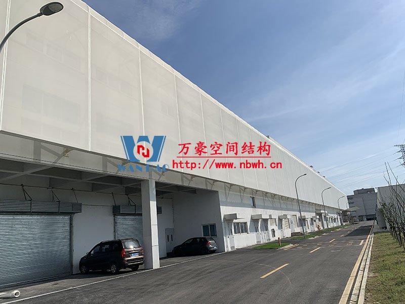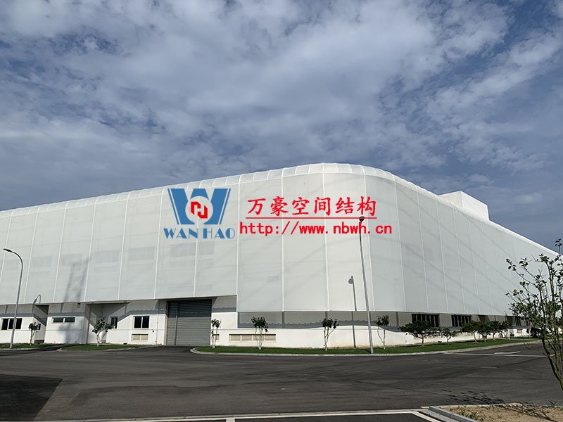 寧波益富樂公司新廠房外立面PTFE網格膜結構項目位于浙江省寧波市奉化區,由萬豪空間結構工程有限公司承建。包括立面、頂部弧面的膜結構和鋼結構,并根據膜結構行業規范進行結構設計深化、采購、制作實施。