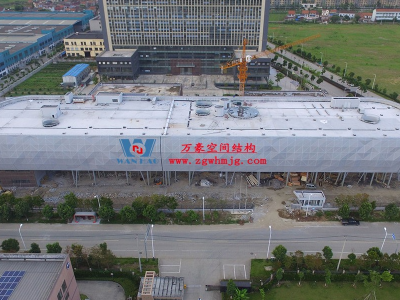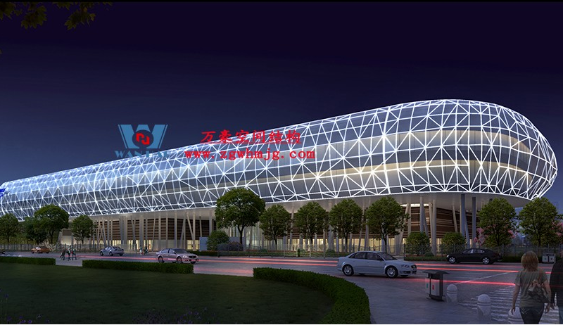 寧波菲仕展廳外立面網格膜結構項目,方案由意大利著名建筑師設計,設計靈感取鉆石之意。為了實現(xiàn)多變的設計效果,整個外立面采用了8000根形狀各異的鋼構件,每根桿件單獨編號、定位,實施難度極大。外層使用PTFE網格膜,樹立了PTFE網格膜使用的新標桿。用鋼量880噸,PTFE膜展開面積12660平方。