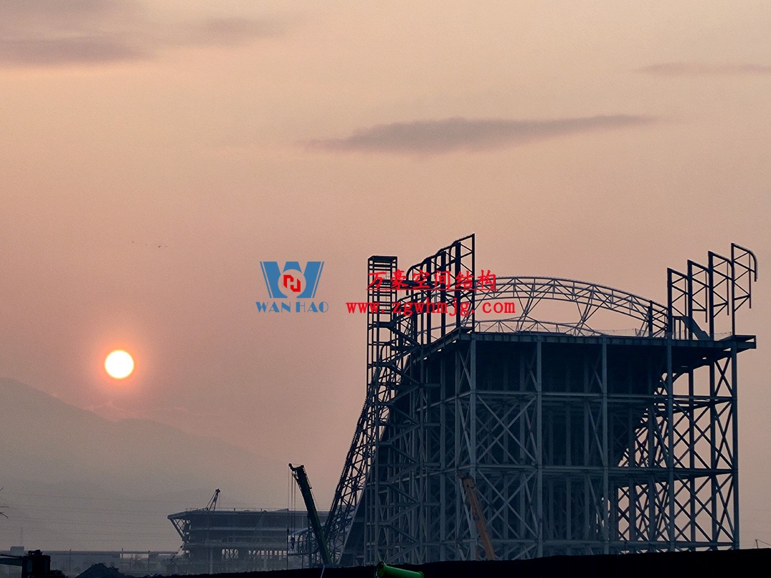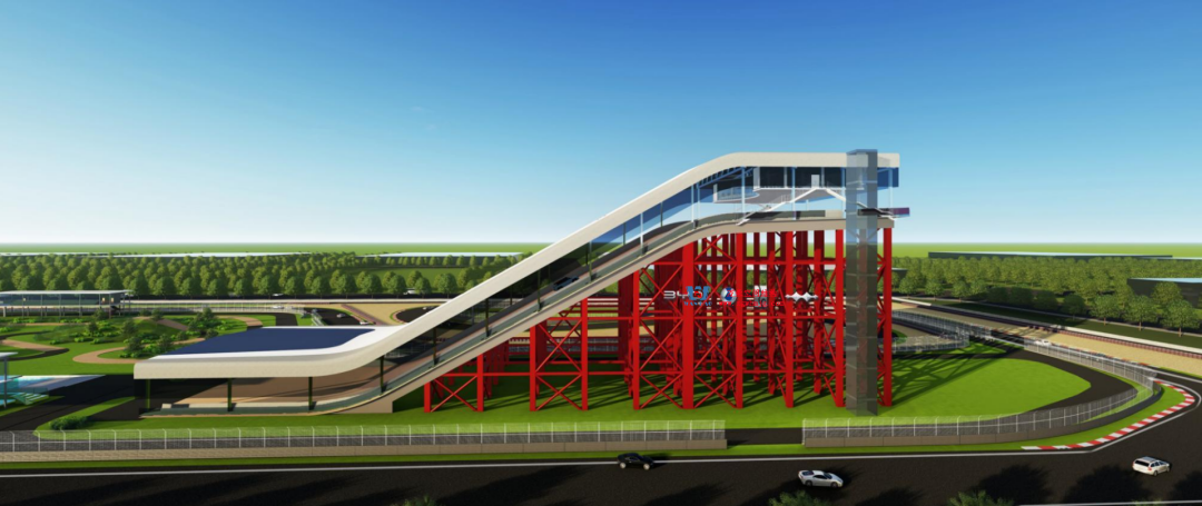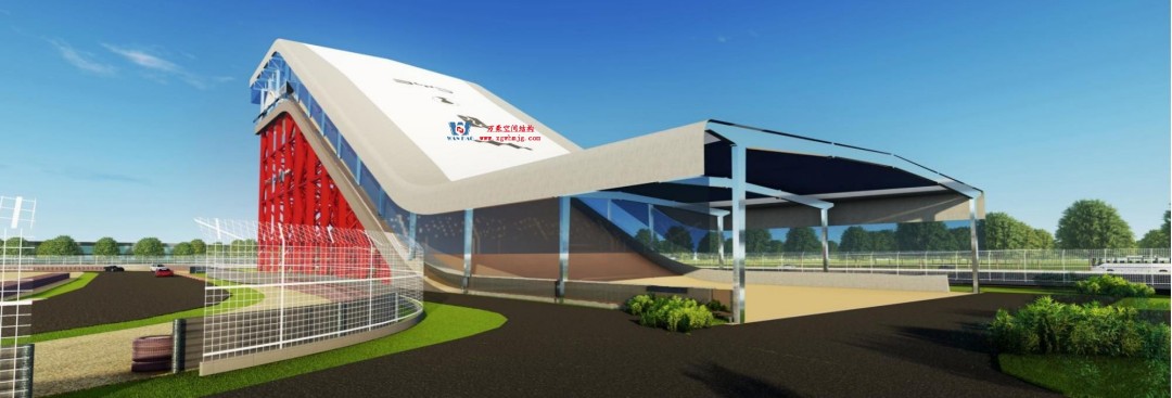 比亞迪紹興嵊州賽車場以極速競技與自然景觀的融合為設計核心,干拔沙坡觀景平臺作為賽道的標志性節(jié)點,同時滿足了功能性、標志性與生態(tài)協(xié)調(diào)性。設計靈感來源于賽車疾馳時揚起的沙浪與風動軌跡,通過鋼結(jié)構(gòu)的剛性骨架與膜材的柔性質(zhì)感,塑造出如沙丘起伏般的動態(tài)形態(tài),既呼應賽車場的速度美學,又為觀眾提供遮陽避雨的舒適空間。該項目PTFE膜屋面展開超3萬平方米。