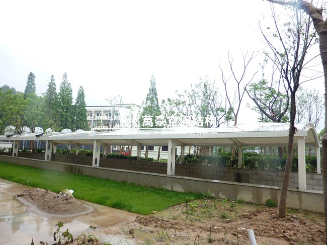 陽明溫泉山莊車庫出入口膜結構位于浙江省寧波余姚市陸埠鎮陽明溫泉山莊內。山莊總建筑面積6.8萬平方米,其建筑群由酒店主樓、別墅、健診中心、室內外溫泉區等區域組成,集溫泉度假、商務會議、高端宴席三大主題。地下車庫出入口膜結構以其獨特的造型和良好的性能,與陽明溫泉山莊顯得十分搭配,為其增加一份特有的色彩。