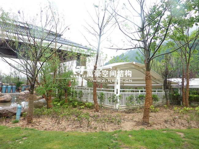 陽明溫泉山莊車庫出入口膜結構 福建酒店張拉膜結構頂棚 餐廳膜結構建筑案例