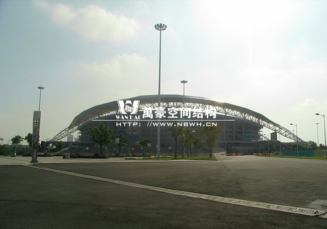 頂層膜結(jié)構(gòu)分內(nèi)外膜,外膜采用PTFE材料,水平投影面積約15000平方米,局部采用PVC內(nèi)膜,覆蓋在比賽場地及觀眾席上方,工程整體結(jié)構(gòu)造型美觀新穎,與周圍環(huán)境相融洽。為寧波市獨具景觀特色的標(biāo)志性建筑。