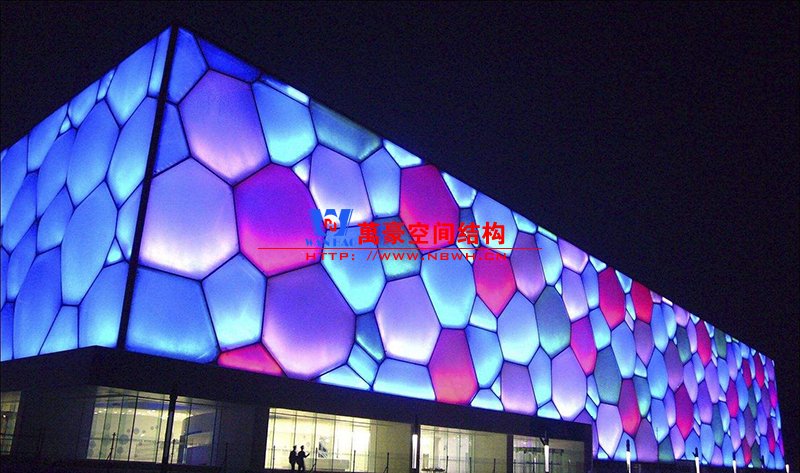 水立方是我國首次使用ETFE充氣式膜材料。在水立方尚未建造之前,我國還沒有在幕墻中使用ETFE膜材料的先例。水立方的整個建筑中除了入口處用了玻璃之外,其他地方全部采用充氣膜材料,內部沒有一根柱子。ETFE充氣膜材料在歐洲有十多年的運用歷史,基本上都是用在游泳館和冬季花園建筑方面的,它質量輕、保溫隔熱性好,同時還有透光、防雨、自潔等特點,最大的充氣膜材料建筑達3萬平方米。