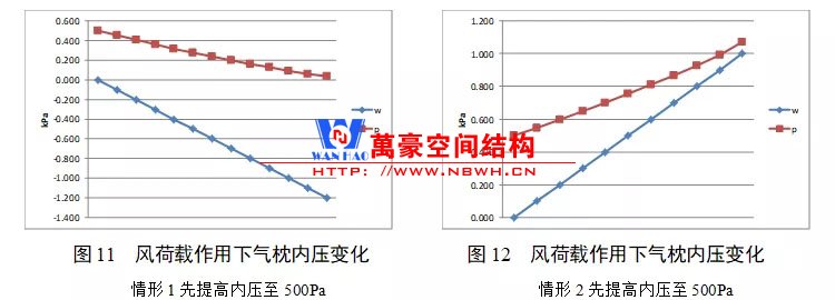 本章在上一章節的基礎上,進一步擴大了研究范圍:在初始內壓基礎上預先提高內壓,再看其在不同風荷載下內壓的變化,圖11與圖12顯示了情形1和情形2在提高內壓至500Pa后的氣枕內壓隨風荷載變化情況: