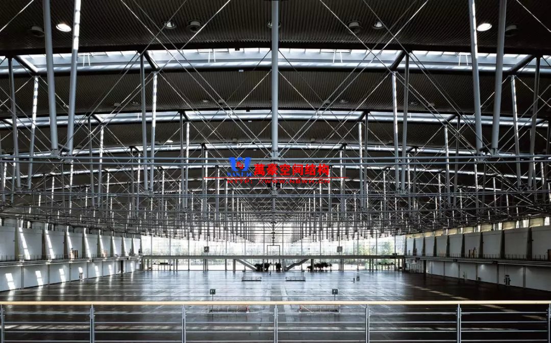 漢諾威會展中心是世界上最大、最負盛名的會展中心,超過50萬m2的凈展面積和每年超過50場的頂級展會,使其幾十年來穩居行業龍頭地位。1994年,在漢諾威會展中心4號展廳的競賽中,德國gmp國際建筑設計有限公司(以下簡稱gmp)和sbp結構工程師事務所(以下簡稱sbp)聯袂中標。展廳提供了一個通過玻璃采光頂自然采光的185.6m×116m的無柱大空間,凈展面積超過21 500㎡。雙層屋面結構的下層以承重金屬波形板將屋頂下的設備管道保護起來,同時利用雙層金屬板結構之間的空腔進行正壓送風,使得灰塵難以進入到空腔和管道。4號廳可以舉辦多種不同類型的活動,特別是容易產生灰塵的馬術等。