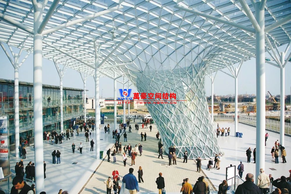 以上各種天幕結構均是支承在周邊建筑或樹形上的。除此以外,還有一種以天幕網(wǎng)格獨立或相對獨立支承的結構,其建筑形態(tài)往往呈現(xiàn)“喇叭形”。