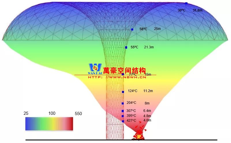 根據(jù)消防規(guī)范,中庭鋼結構要涂防火涂層以提供1.5~3小時的耐火保護。通過性能化分析,設計師提出創(chuàng)新的水簾保護系統(tǒng)作為鋼材防火替代方案。水簾經(jīng)由氣化,可以吸收火與煙霧大部分熱量,使鋼材表面溫度顯著降低。