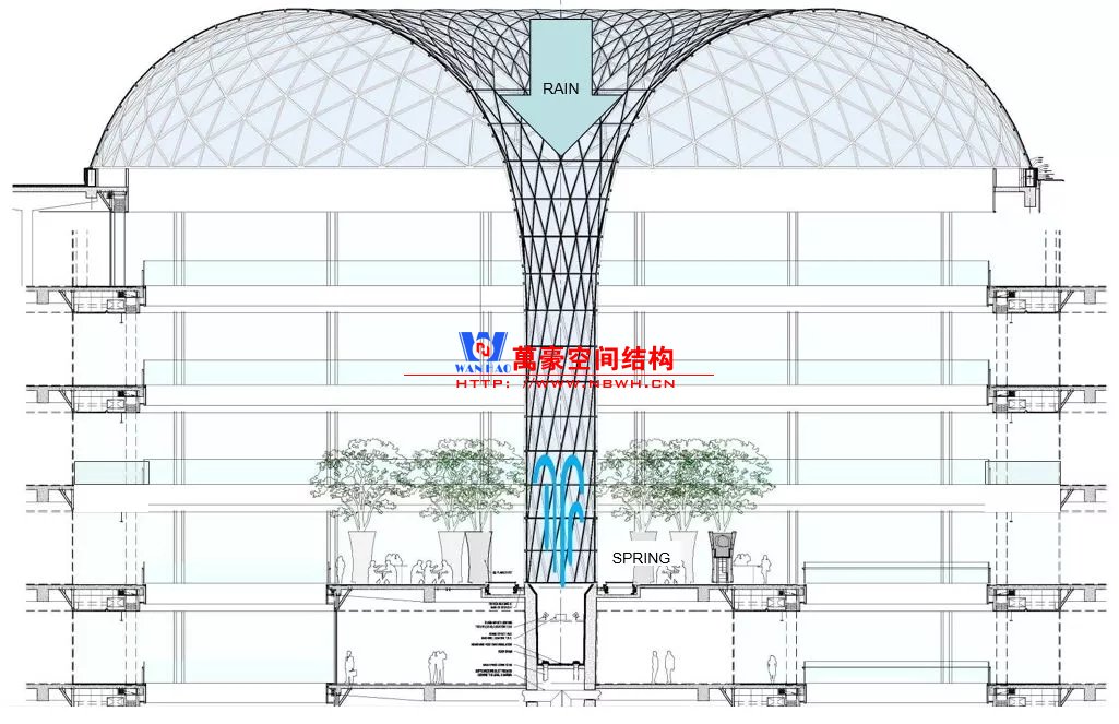 巨大透明天幕能增強自然采光和視覺通透性,然而另一方面,也帶來眩光和太陽熱輻射增加等潛在問題。因此,設計師采用低輻射鍍膜玻璃、通風裝置和氣簾、雨水收集系統(tǒng)等兼顧了訪客的最佳舒適度和綠色生態(tài)品質(zhì)。