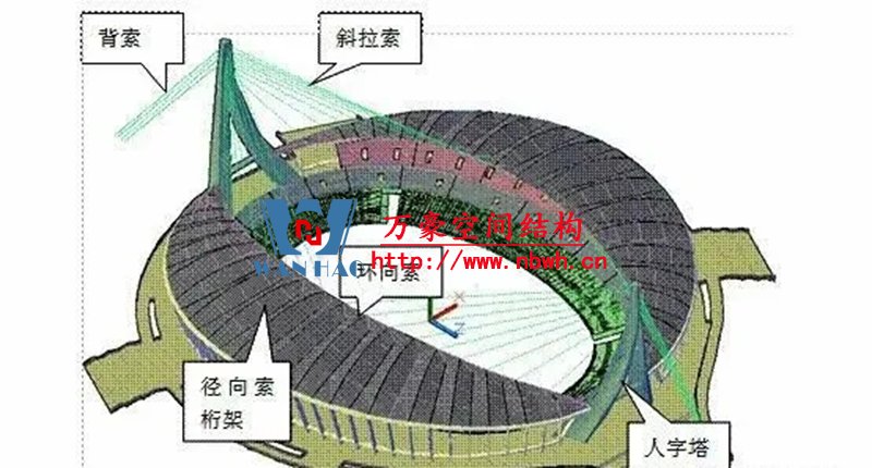 1、整個索網、環梁和吊塔形成整體受力體系,結構受力傳遞路徑復雜;