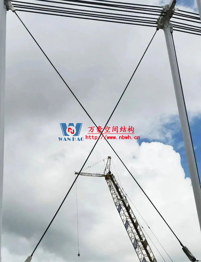三亞體育場總建筑面積8.8萬余平米,體育場屋蓋為輪輻式索桁架結構,平面投影短軸224米、長軸261.8米,中心開口短軸134米,長軸171.8米。為提升結構抗風能力,屋蓋結構布置內環交叉索;為降低內環交叉索對鎖夾造成的不平衡力,該項目創新應用了強模比遠高于普通鋼索的CFRP平行板索,以新材料、新構件完美解決了結構問題。