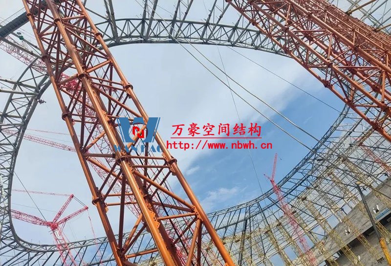 鋼罩棚平衡區長度27m,內部主桁架懸挑長度最大達58m。懸挑部分位于看臺上方,安裝高度高達59.5m。單榀桁架最大單重55t,單根鋼柱重量達60t。