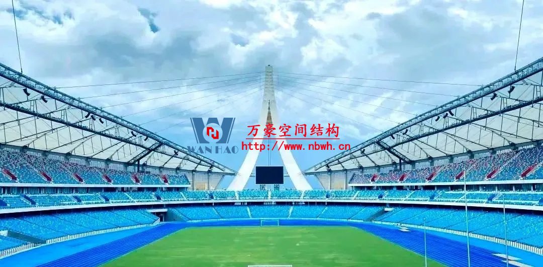 “‘豎琴’與‘天傘’的交相輝映”是對斜拉索桁柔性罩棚受力體系的形象描述。兩座高達(dá)99米“人”字形索塔一端拉起18根斜拉索,另一端連接8根背索,猶如兩把空中“豎琴”將索桁架罩棚輕輕吊起,在大跨度張拉中演奏一曲建筑贊歌。
