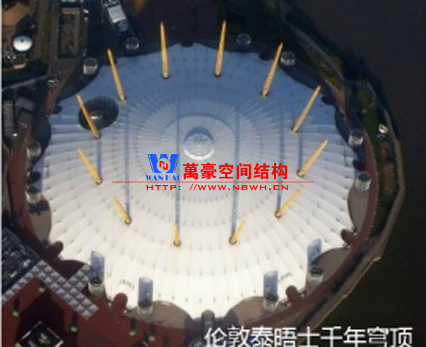千年穹頂1999年底建成,其造型很奇特,它有12根穿出屋面高達100米的桅桿,屋蓋采用圓球形的張拉膜結構。膜面支承在72根幅射狀的鋼索上,遠遠望去像一個白色的大帳篷。