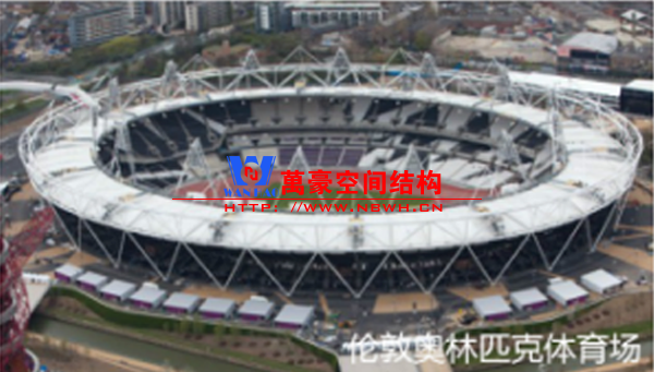倫敦奧林匹克體育場在奧運和殘奧期間是8萬座位的體育場,賽后轉換成一個2.5萬座位的體育場。人字形柱支承外壓縮環桁架,內張力環采用索,其間輻射布置雙層徑向索形成索網,上覆112片PVC膜材張緊形成罩蓬,是典型的索系支承式膜結構。