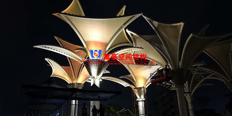 其中主席臺龍舟拉膜項目高度為7.25米,膜結構屋面材質為PTFE膜材。廣場鋼拉膜項目由六個龍船花造形景觀組成,每個龍船花景觀造形立柱的高度不得低于3.80米,花瓣造形最低高度 7.54米,花瓣造形最高高度9.608米,膜結構屋面材質為 PTFE網格基布雙面貼透明ETFE建筑膜。