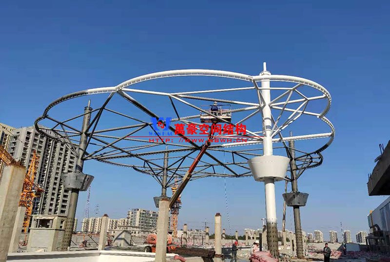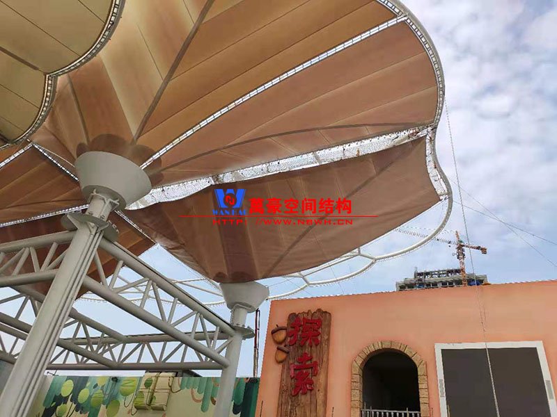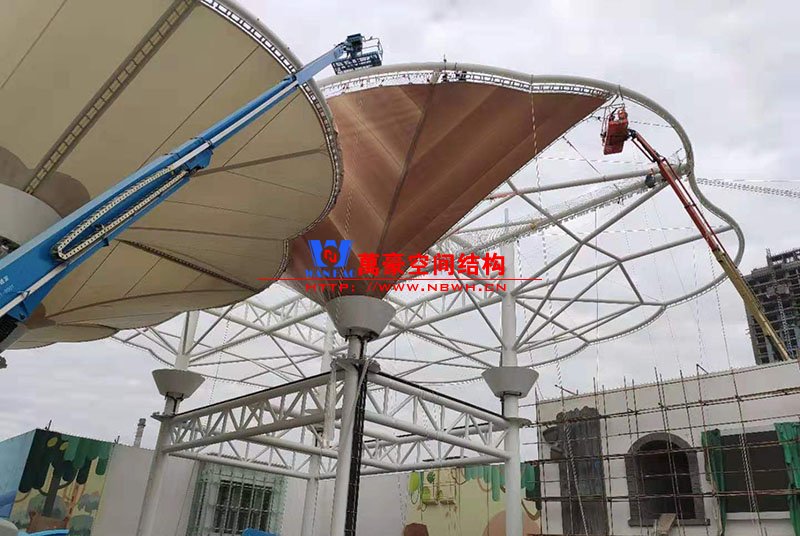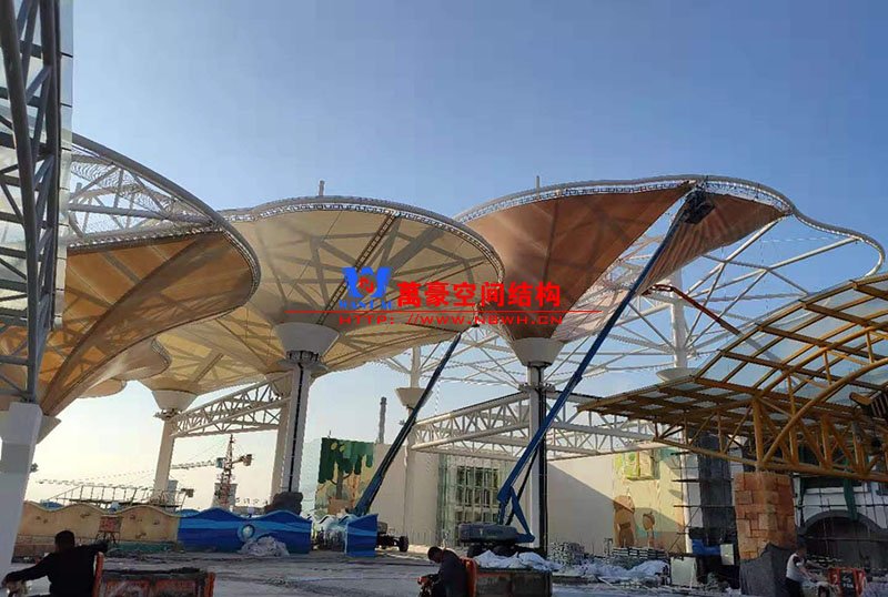 聊城歡樂小鎮七彩云朵膜結構項目位于山東省聊城市衛育路東香江路北萬達廣場內,該工程由寧波萬豪空間結構工程有限公司承建。 該項目設計思路沿用了上海世博軸的倒傘形狀,其中最大的一個傘形面積達8000平米,工程共計用鋼1500噸,膜結構展開面積3萬平米,是鋼、膜、索結合真正意義上的大型索膜結構。