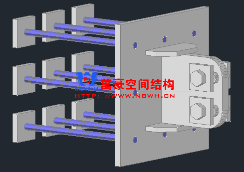 施工安裝步驟:預(yù)埋件測量及校正 → 預(yù)埋件鉸接耳板焊接 → 牛腿螺栓固定 → 主結(jié)構(gòu)吊裝 → 連接梁、斜撐吊裝 → 馬道安裝 → 膜結(jié)構(gòu)安裝。