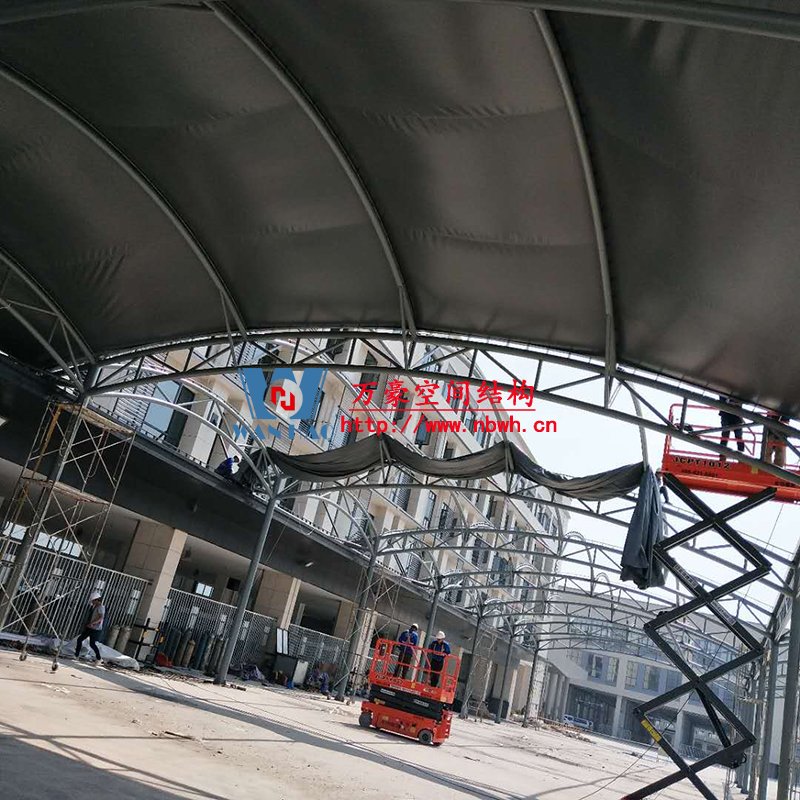 目前,該膜結(jié)構(gòu)工程的鋼結(jié)構(gòu)工程部分已完成并經(jīng)初步驗(yàn)收,膜結(jié)構(gòu)進(jìn)入安裝階段。