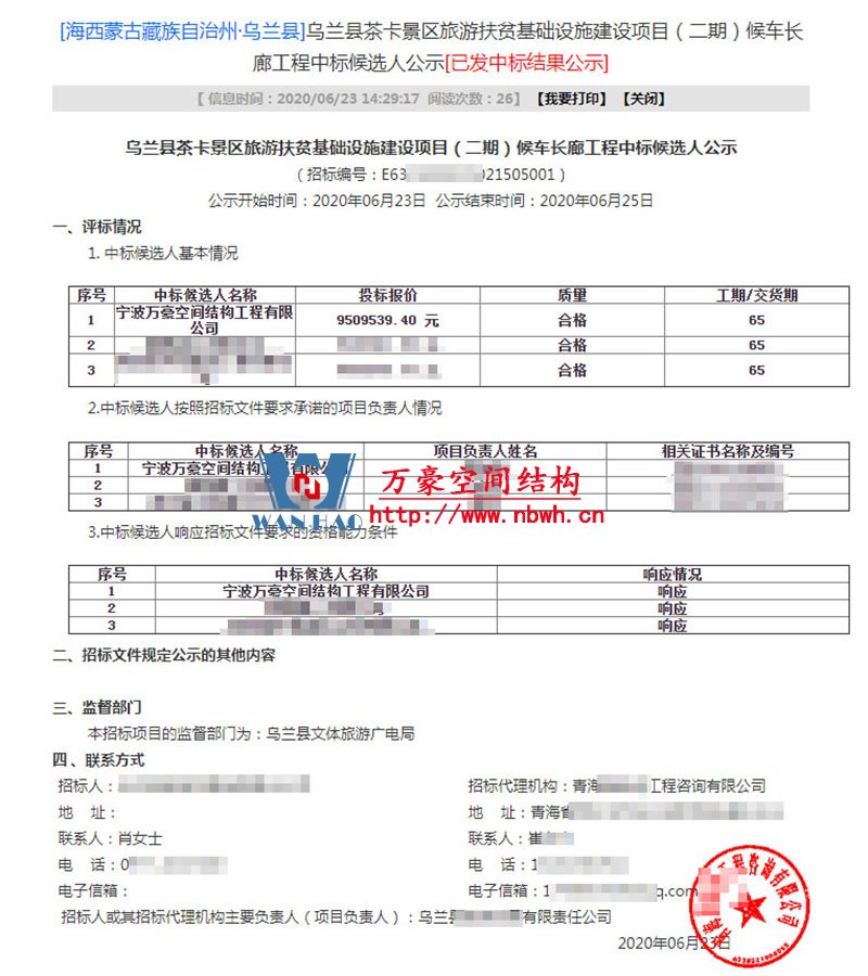 喜訊!!! 祝賀我司中標烏蘭縣茶卡景區(qū)旅游扶貧基礎設施項目(二期)膜結構工程。 該項目位于青海省海西蒙古族藏族自治州烏蘭縣茶卡景區(qū),工程用鋼量200噸,膜結構展開面積6000平米,建成后將成為當?shù)亓硪坏貥诵越ㄖ?/span> 這是萬豪2020年的第8標,萬豪定當再接再厲,完美完成此次工程,大家拭目以待。