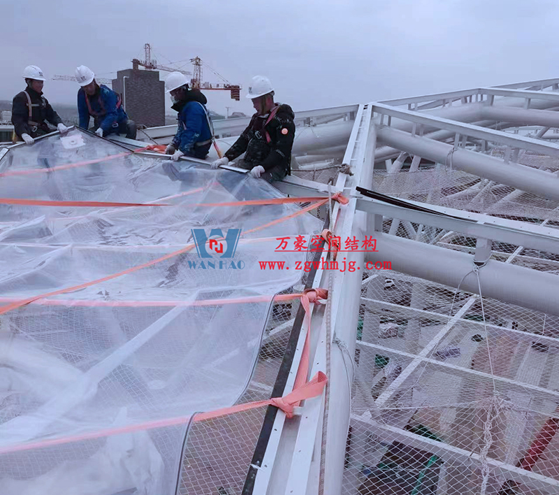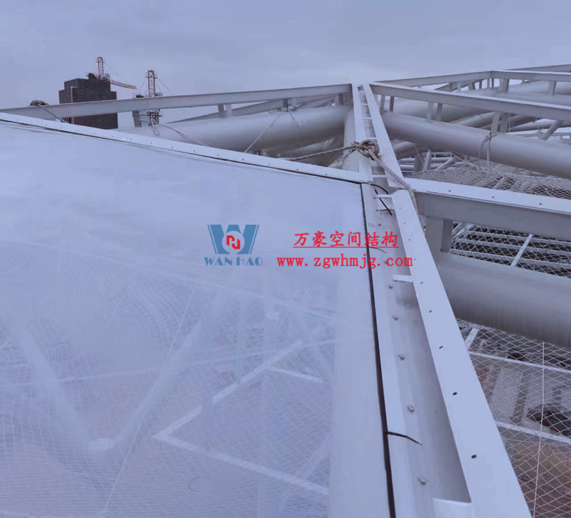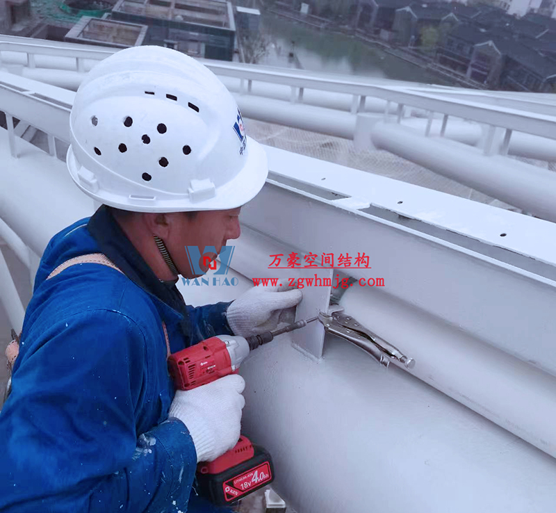 文一塘溪津門天幕鋼結(jié)構(gòu)及ETFE氣枕膜工程由寧波萬豪空間結(jié)構(gòu)工程有限公司承建,該項(xiàng)目用鋼量900噸,膜結(jié)構(gòu)展開面積7000平米。今年以來,萬豪施工團(tuán)隊緊抓時間節(jié)點(diǎn),工程進(jìn)度推進(jìn)迅速。