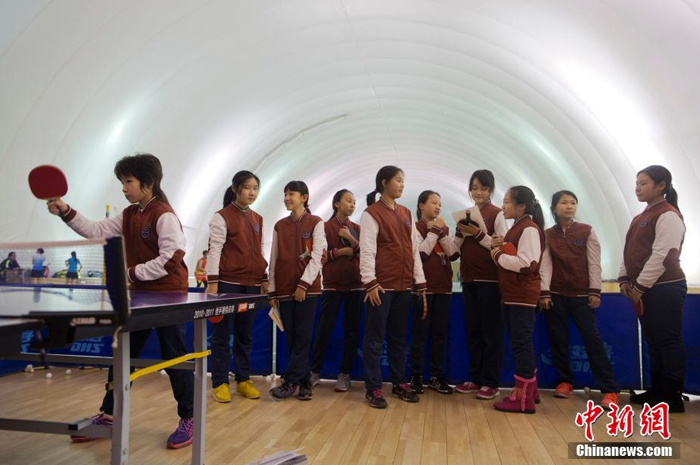 12月1日,一群學生在北京市某學校充氣膜體育館學習乒乓球。 (來自:中國新聞網(wǎng))