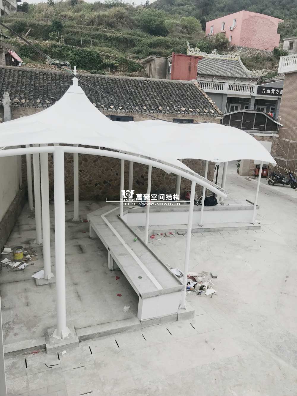 大陳島海鮮膜結構工程位于下大陳島衛星村步行街后半段(臺州雷力建設有限公司對面),該工程由我司現場考察、多次深化、制作及安裝,設計抗臺等級12級,鋼構最高點高度達6.5米;