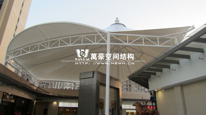 本工程總建筑面積約900平方米,主體一根主柱、九根支柱,四周單片桁架連接,總體一個(gè)帽柱,直線長(zhǎng)為26.9米,帽柱總高33.6米,寬為27.8米。因?yàn)楸竟こ套湓谏虡I(yè)區(qū)中心,四周都是五層商鋪,吊車無法進(jìn)入施工現(xiàn)場(chǎng),先用25噸吊車把材料送到五層樓房頂,后用人工或手拉葫蘆進(jìn)行運(yùn)送和安裝。施工范圍包括鋼結(jié)構(gòu)系統(tǒng)與膜材系統(tǒng)的制作和現(xiàn)場(chǎng)安裝施工,現(xiàn)工程已經(jīng)完工。